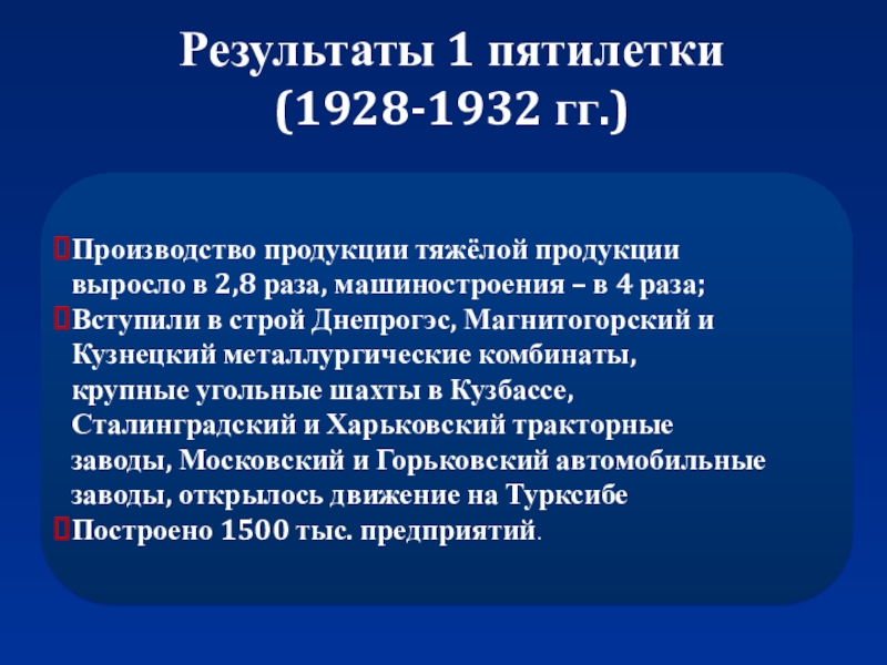 Слайд 13Результаты 1 пятилетки (1928-1932 гг.)