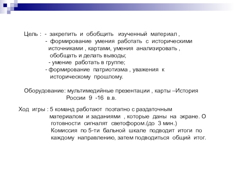 Ход игры : 5 команд работают поэтапно с раздаточным
