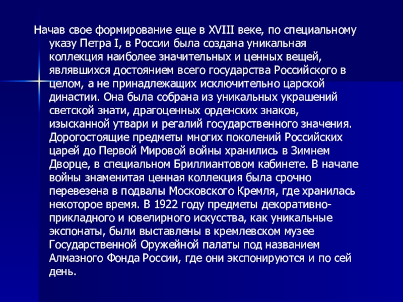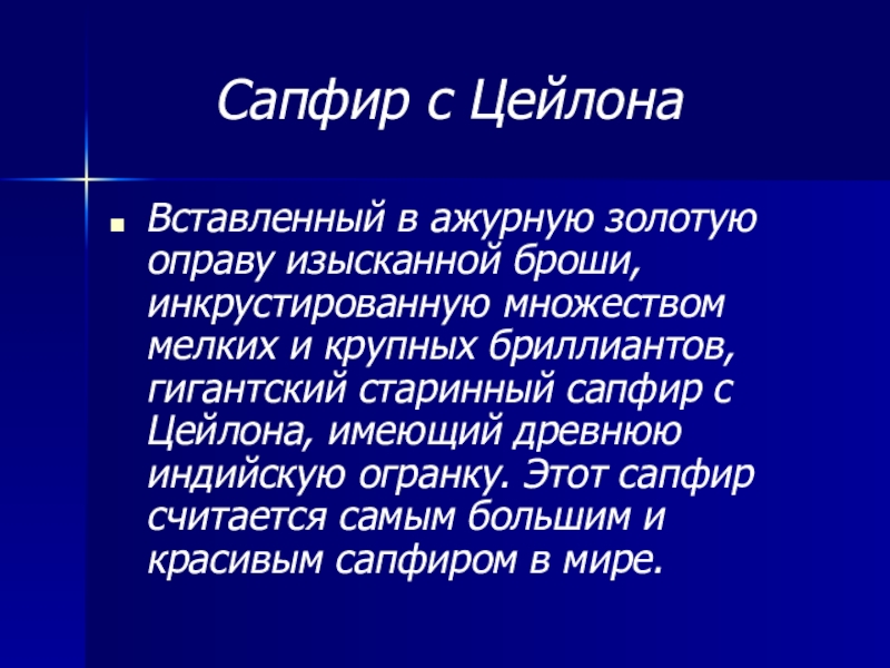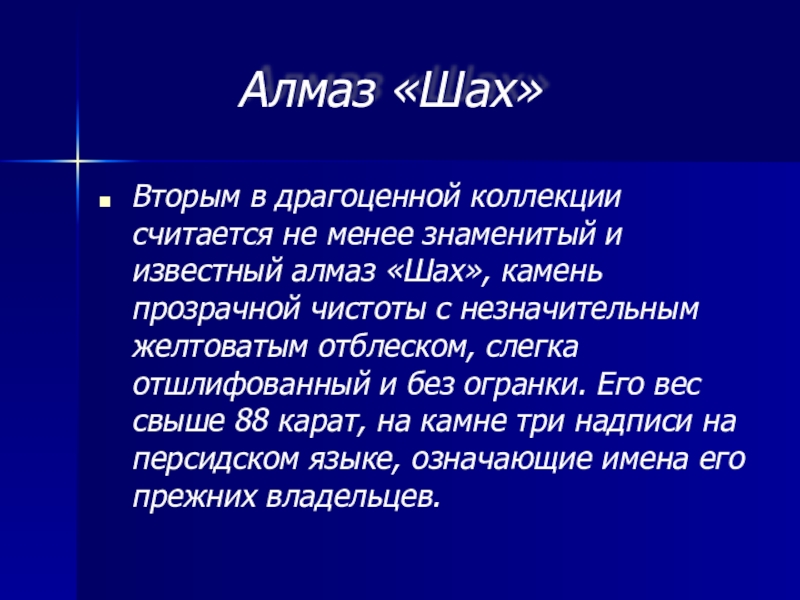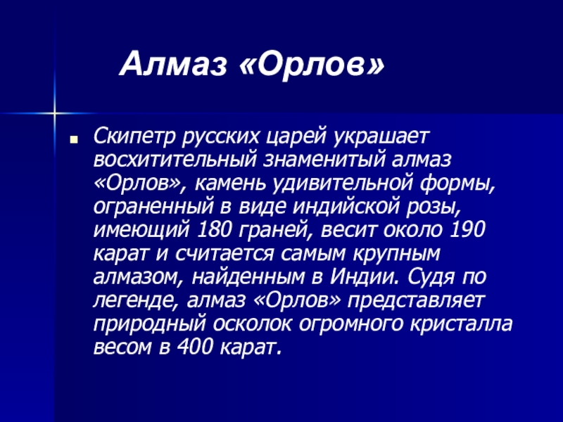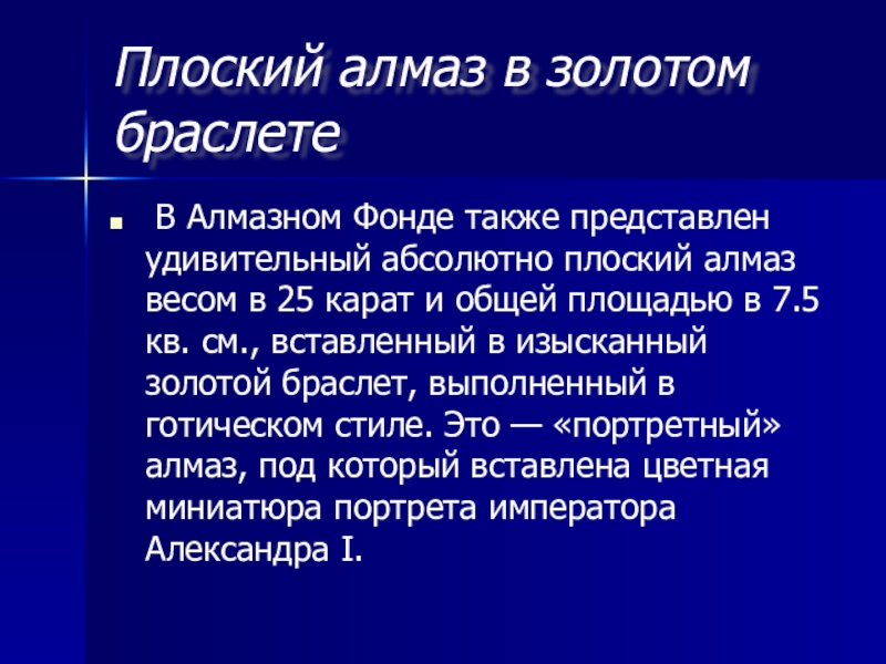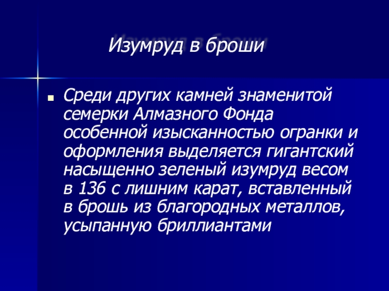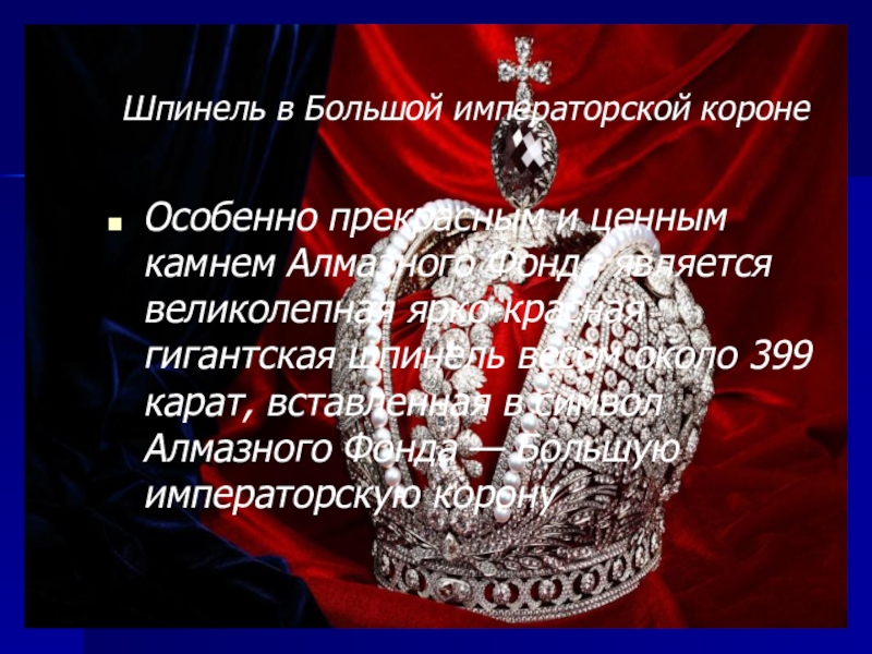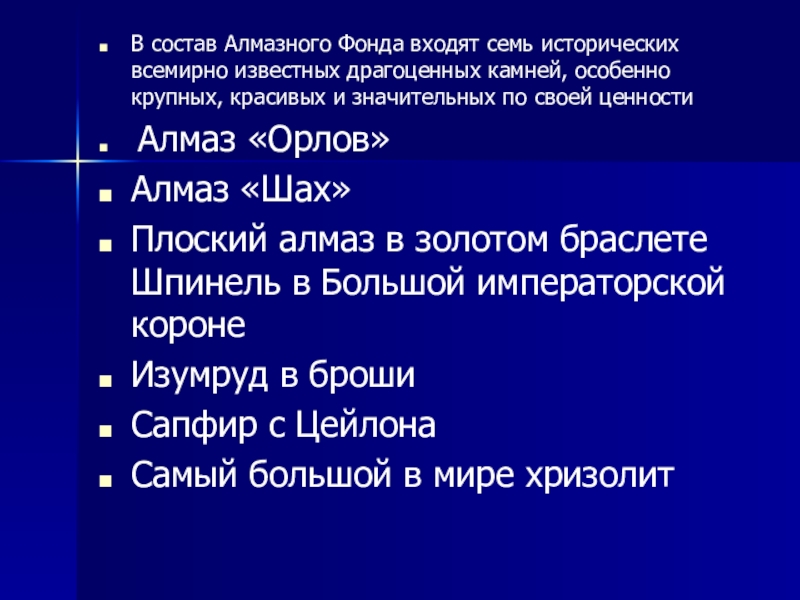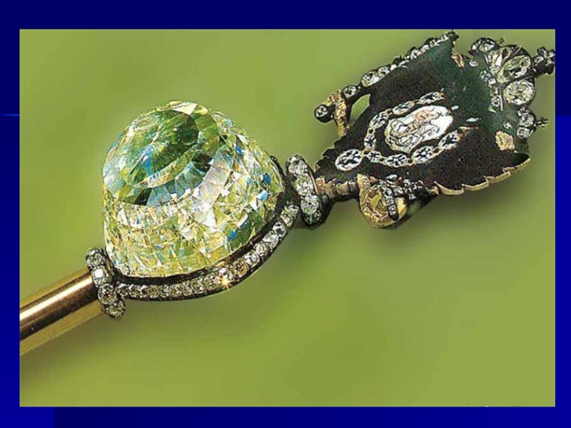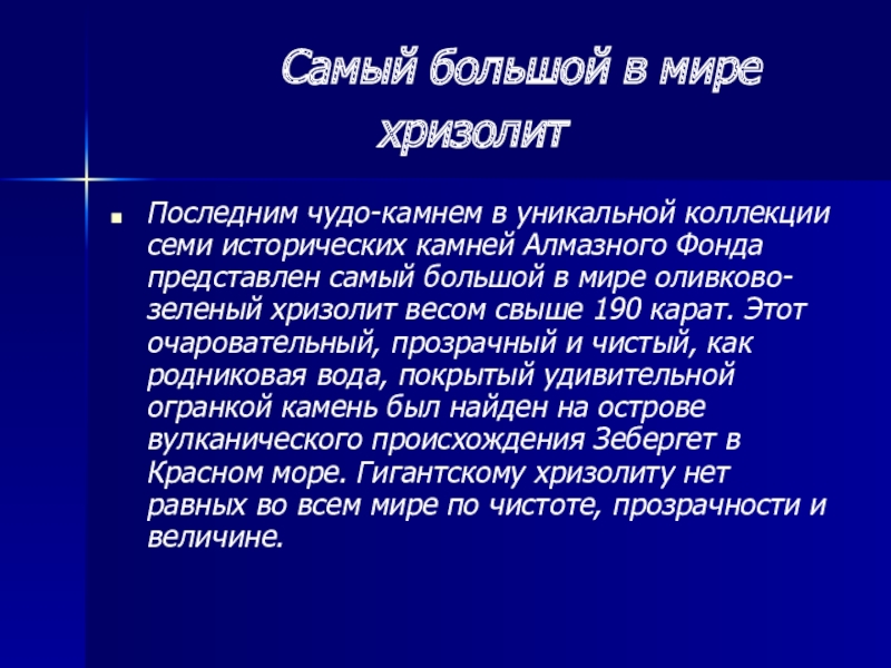Последним чудо-камнем в уникальной коллекции семи исторических камней Алмазного Фонда представлен самый большой в мире оливково-зеленый хризолит весом свыше 190 карат. Этот очаровательный, прозрачный и чистый, как родниковая вода, покрытый удивительной огранкой камень был найден на острове вулканического происхождения Зебергет в Красном море. Гигантскому хризолиту нет равных во всем мире по чистоте, прозрачности и величине.