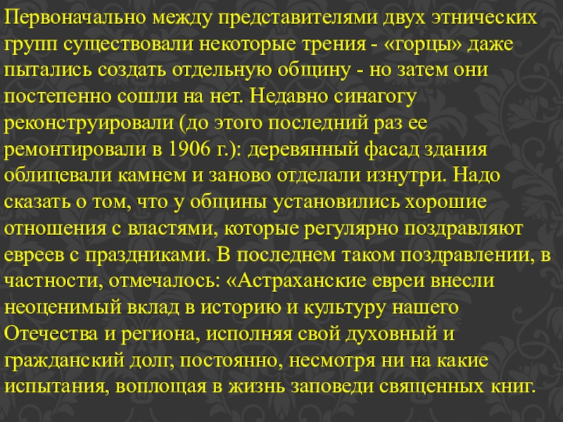даже пытались создать отдельную общину - но затем они постепенно сошли на нет. Недавно синагогу реконструировали (до этого последний раз ее ремонтировали в 1906 г.): деревянный фасад здания облицевали камнем и заново отделали изнутри. Надо сказать о том, что у общины установились хорошие отношения с властями, которые регулярно поздравляют евреев с праздниками. В последнем таком поздравлении, в частности, отмечалось: «Астраханские евреи внесли неоценимый вклад в историю и культуру нашего Отечества и региона, исполняя свой духовный и гражданский долг, постоянно, несмотря ни на какие испытания, воплощая в жизнь заповеди священных книг.