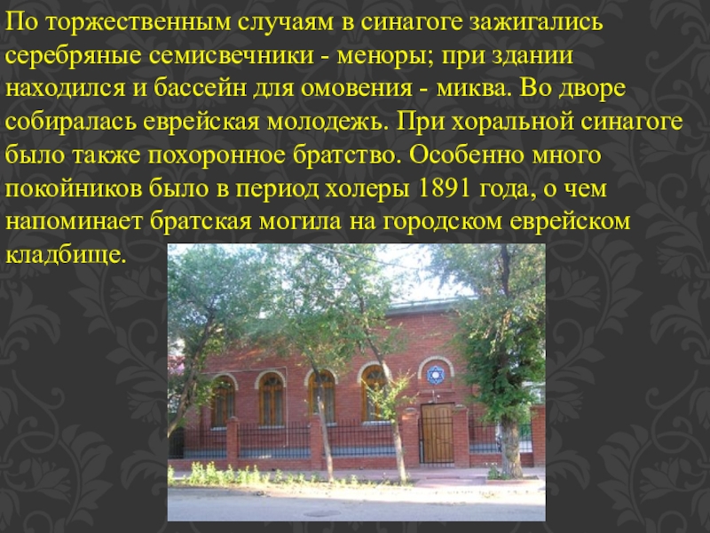 здании находился и бассейн для омовения - миква. Во дворе собиралась еврейская молодежь. При хоральной синагоге было также похоронное братство. Особенно много покойников было в период холеры 1891 года, о чем напоминает братская могила на городском еврейском кладбище.