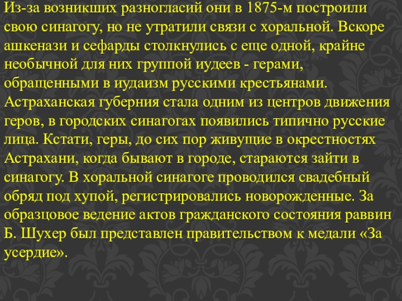 утратили связи с хоральной. Вскоре ашкенази и сефарды столкнулись с еще одной, крайне необычной для них группой иудеев - герами, обращенными в иудаизм русскими крестьянами. Астраханская губерния стала одним из центров движения геров, в городских синагогах появились типично русские лица. Кстати, геры, до сих пор живущие в окрестностях Астрахани, когда бывают в городе, стараются зайти в синагогу. В хоральной синагоге проводился свадебный обряд под хупой, регистрировались новорожденные. За образцовое ведение актов гражданского состояния раввин Б. Шухер был представлен правительством к медали «За усердие».