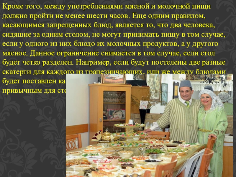 менее шести часов. Еще одним правилом, касающимся запрещенных блюд, является то, что два человека, сидящие за одним столом, не могут принимать пищу в том случае, если у одного из них блюдо их молочных продуктов, а у другого мясное. Данное ограничение снимается в том случае, если стол будет четко разделен. Например, если будут постелены две разные скатерти для каждого из трапезничающих, или же между блюдами будет поставлен какой-либо предмет, который не является привычным для стола.