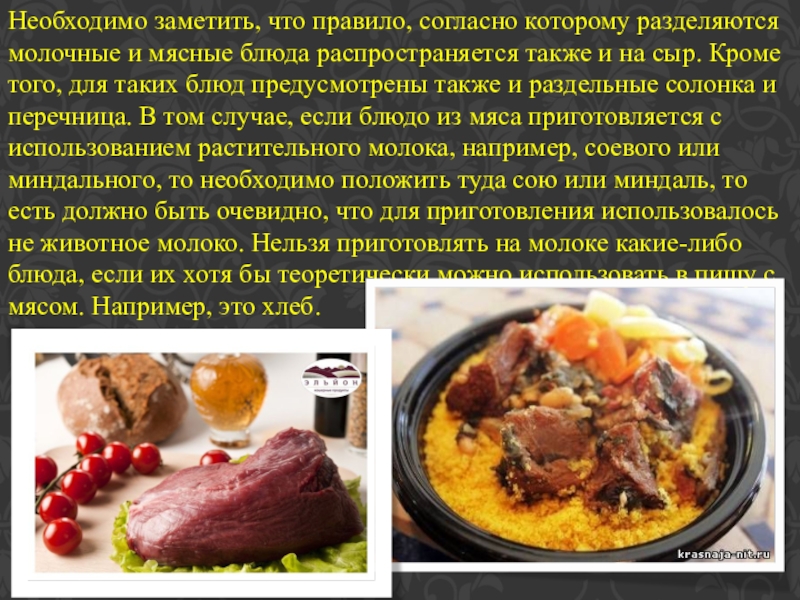 распространяется также и на сыр. Кроме того, для таких блюд предусмотрены также и раздельные солонка и перечница. В том случае, если блюдо из мяса приготовляется с использованием растительного молока, например, соевого или миндального, то необходимо положить туда сою или миндаль, то есть должно быть очевидно, что для приготовления использовалось не животное молоко. Нельзя приготовлять на молоке какие-либо блюда, если их хотя бы теоретически можно использовать в пищу с мясом. Например, это хлеб.