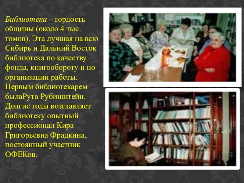 всю Сибирь и Дальний Восток библиотека по качеству фонда, книгообороту и по организации работы. Первым библиотекарем былаРута Рубинштейн. Долгие годы возглавляет библиотеку опытный профессионал Кира Григорьевна Фрадкина, постоянный участник ОФЕКов.