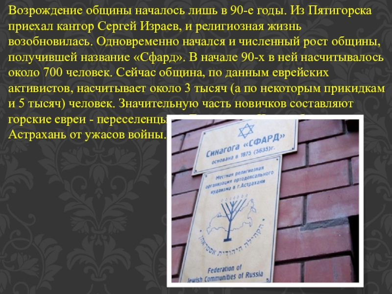 Сергей Израев, и религиозная жизнь возобновилась. Одновременно начался и численный рост общины, получившей название «Сфард». В начале 90-х в ней насчитывалось около 700 человек. Сейчас община, по данным еврейских активистов, насчитывает около 3 тысяч (а по некоторым прикидкам и 5 тысяч) человек. Значительную часть новичков составляют горские евреи - переселенцы из Дагестана и Чечни, бежавшие в Астрахань от ужасов войны.