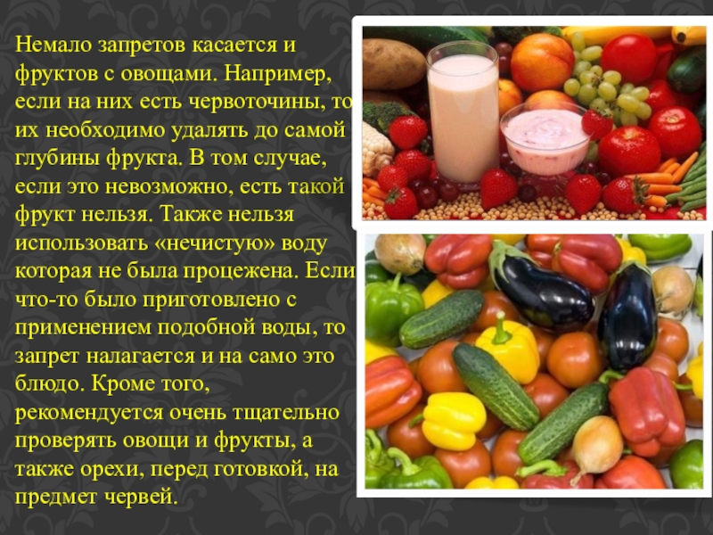 есть червоточины, то их необходимо удалять до самой глубины фрукта. В том случае, если это невозможно, есть такой фрукт нельзя. Также нельзя использовать «нечистую» воду которая не была процежена. Если что-то было приготовлено с применением подобной воды, то запрет налагается и на само это блюдо. Кроме того, рекомендуется очень тщательно проверять овощи и фрукты, а также орехи, перед готовкой, на предмет червей.