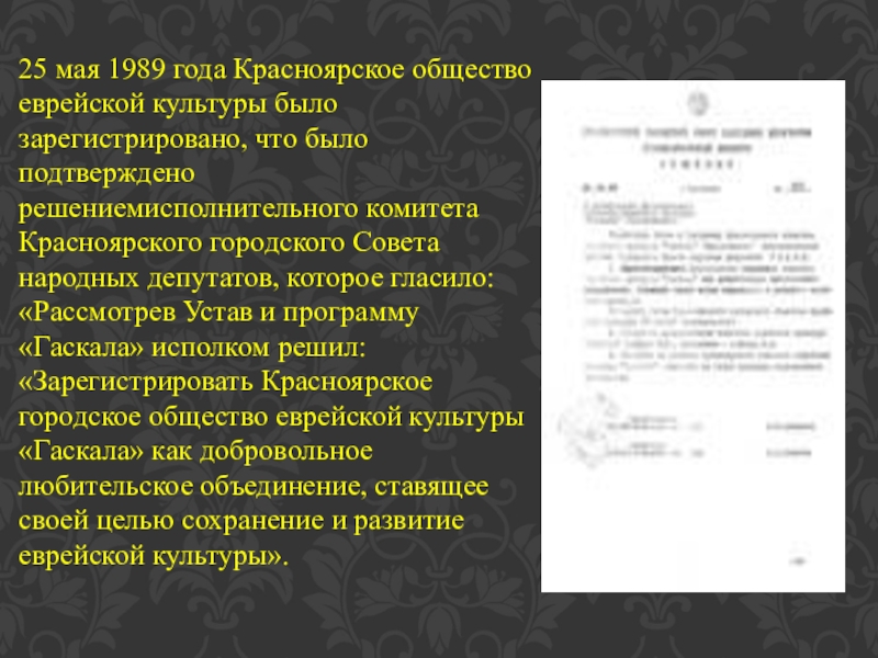 было подтверждено решениемисполнительного комитета Красноярского городского Совета народных депутатов, которое гласило: «Рассмотрев Устав и программу «Гаскала» исполком решил: «Зарегистрировать Красноярское городское общество еврейской культуры «Гаскала» как добровольное любительское объединение, ставящее своей целью сохранение и развитие еврейской культуры».