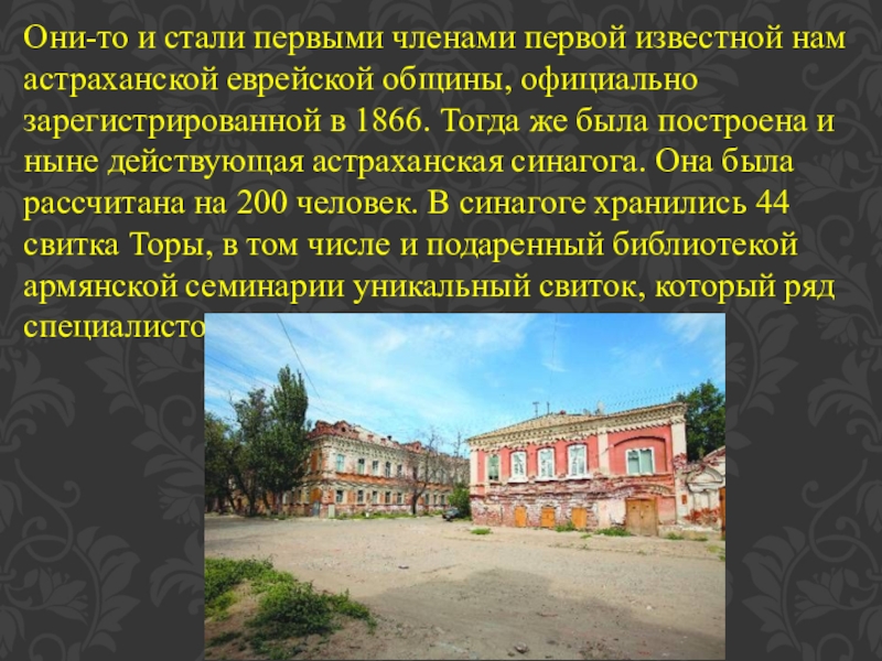 официально зарегистрированной в 1866. Тогда же была построена и ныне действующая астраханская синагога. Она была рассчитана на 200 человек. В синагоге хранились 44 свитка Торы, в том числе и подаренный библиотекой армянской семинарии уникальный свиток, который ряд специалистов относит к хазарским временам.