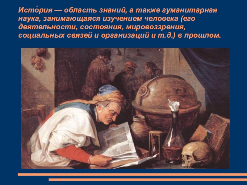 Слайд 2Исто́рия — область знаний, а также гуманитарная наука, занимающаяся изучением человека