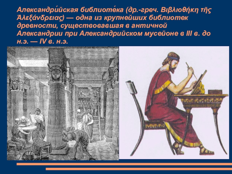 Слайд 16Александри́йская библиоте́ка (др.-греч. Βιβλιοθήκη τῆς Ἀλεξάνδρειας) — одна из крупнейших библиотек