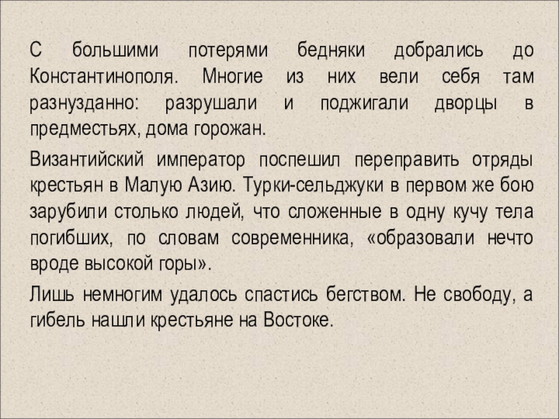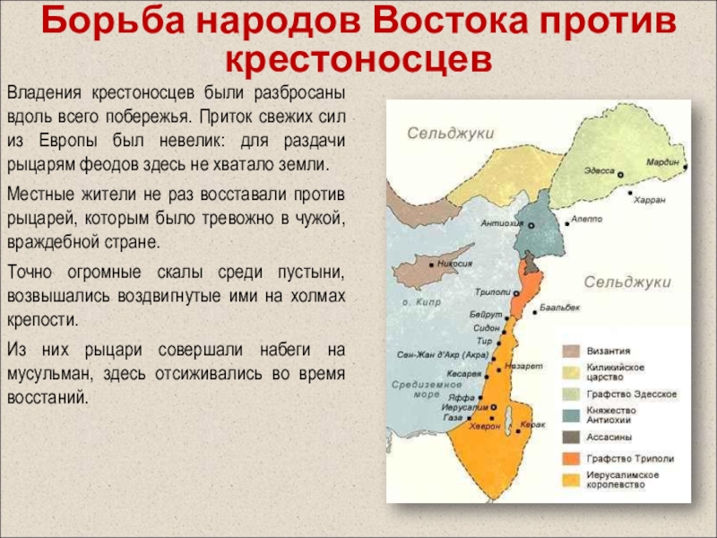 Разграбив богатейший город Европы, рыцари не пошли на Иерусалим, а обосновались на территории Византии. Они создали государство со столицей в Константинополе - Латинскую империю. Более 50 лет местное население боролось против завоевателей.
