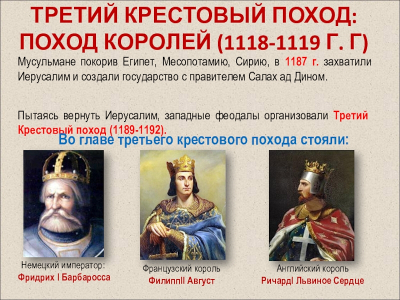 Пытаясь вернуть Иерусалим, западные феодалы организовали Третий Крестовый поход (1189-1192).