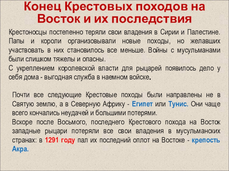 Вскоре после Восьмого, последнего Крестового похода на Восток западные рыцари потеряли все свои владения в мусульманских странах: в 1291 году пал их последний оплот на Востоке - крепость Акра.