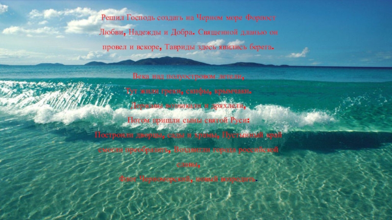 Слайд 7Решил Господь создать на Черном море Форпост Любви, Надежды и Добра.