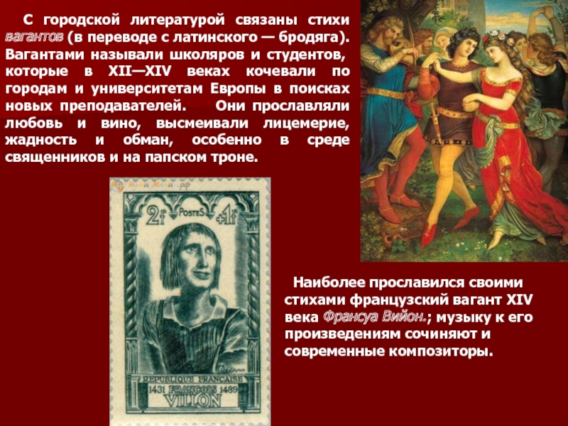 Наиболее прославился своими стихами французский вагант XIV века Франсуа Вийон.; музыку к его произведениям сочиняют и современные композиторы.