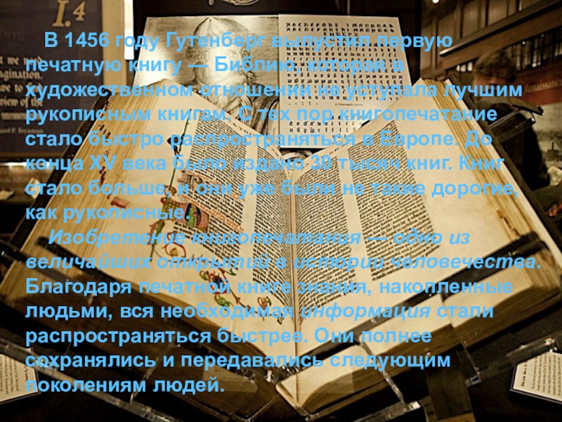 В середине XV века немец Иоганн Гутенберг (ок. 1399—1468) изобрёл книгопечатание. После долгих и упорных трудов и поисков он стал отливать из металла отдельные литеры (буквы); из них составлялись строки и страницы набора, с которого делался оттиск на бумагу. С помощью разборного шрифта можно было набрать сколько угодно страниц любого текста. Гутенберг изобрёл и печатный станок.