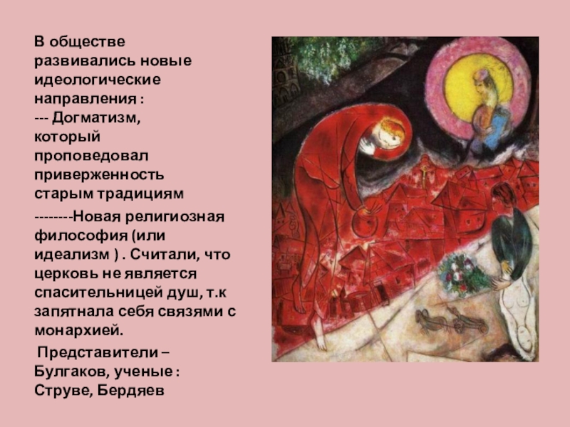 --------Новая религиозная философия (или идеализм ) . Считали, что церковь не является спасительницей душ, т.к запятнала себя связями с монархией.