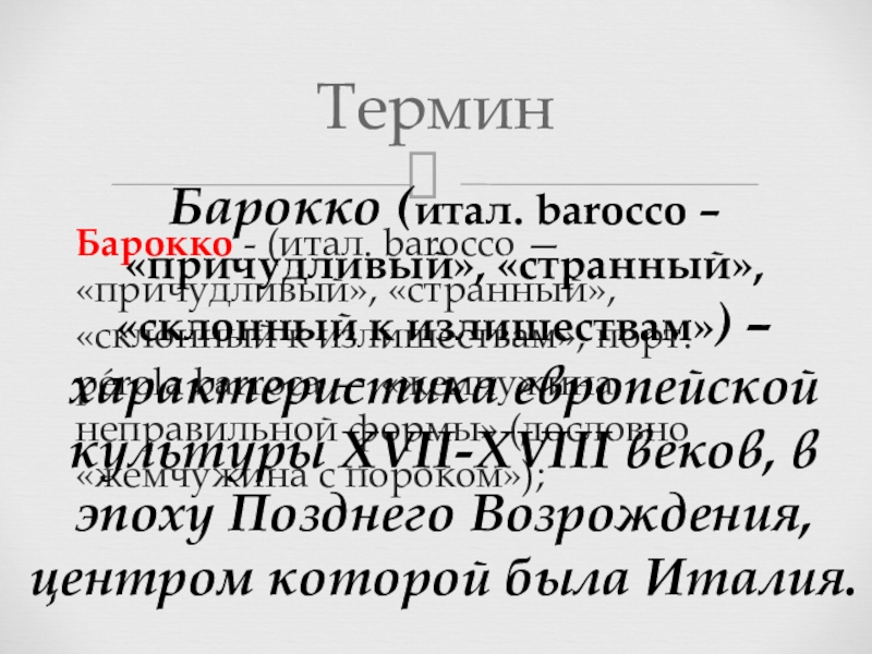 Барокко (итал. barocco – «причудливый», «странный», «склонный к излишествам») – характеристика европейской культуры XVII-XVIII веков, в эпоху Позднего Возрождения, центром которой была Италия.