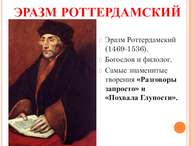 ЭРАЗМ РОТТЕРДАМСКИЙ Эразм Роттердамский (1469-1536).Богослов и филолог. Самые знаменитые творения «Разговоры запросто» и «Похвала Глупости».
