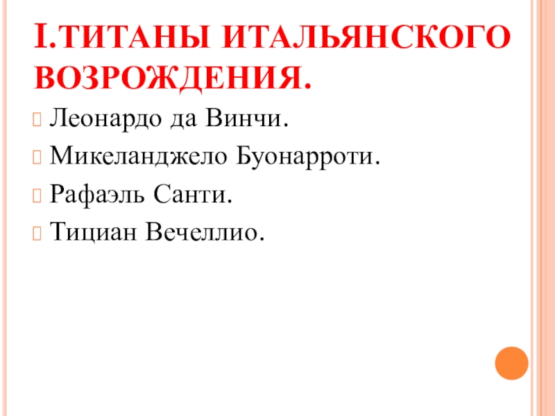 I.ТИТАНЫ ИТАЛЬЯНСКОГО ВОЗРОЖДЕНИЯ.Леонардо да Винчи.Микеланджело Буонарроти.Рафаэль Санти.Тициан Вечеллио.
