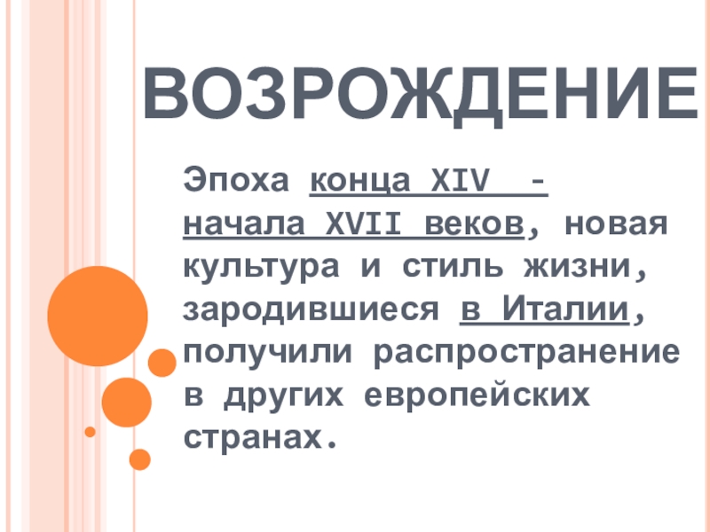 ВОЗРОЖДЕНИЕЭпоха конца XIV - начала XVII веков, новая культура и стиль жизни, зародившиеся в Италии, получили распространение