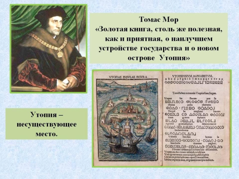 ТОМАС МОР1478-1535Английский гуманист. Основатель утопического социализма.Главное произведение - «Утопия» - выдуманный остров, на котором находится идеальное гос-во.