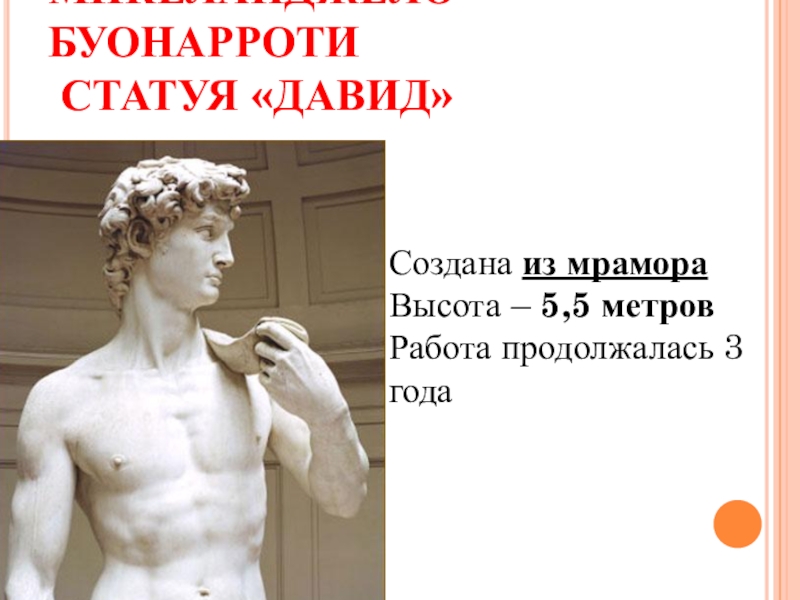МИКЕЛАНДЖЕЛО БУОНАРРОТИ  СТАТУЯ «ДАВИД» Создана из мрамораВысота – 5,5 метровРабота продолжалась 3 года