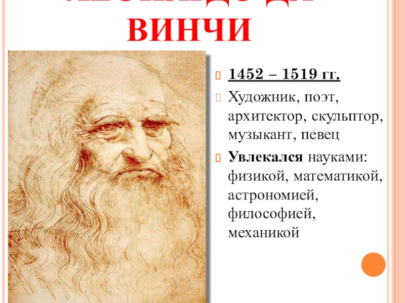 ЛЕОНАРДО ДА ВИНЧИ1452 – 1519 гг.Художник, поэт, архитектор, скульптор, музыкант, певецУвлекался науками: физикой, математикой, астрономией, философией, механикой