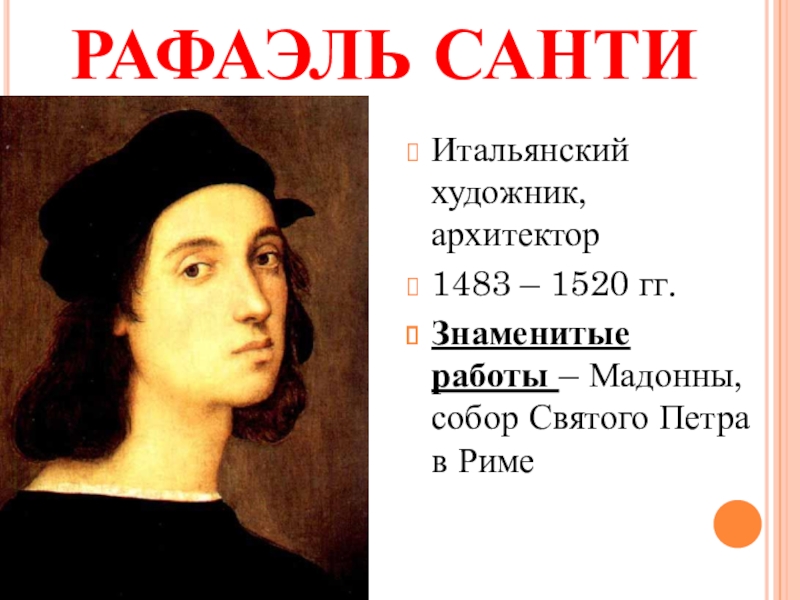 РАФАЭЛЬ САНТИИтальянский художник, архитектор1483 – 1520 гг.Знаменитые работы – Мадонны, собор Святого Петра в Риме