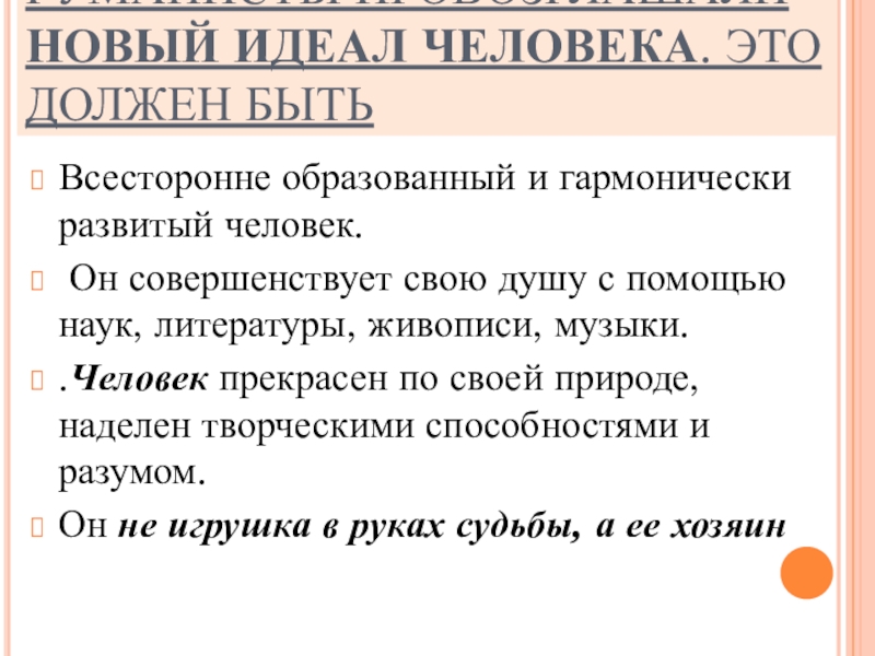 ГУМАНИСТЫ ПРОВОЗГЛАШАЛИ НОВЫЙ ИДЕАЛ ЧЕЛОВЕКА. ЭТО ДОЛЖЕН БЫТЬВсесторонне образованный и гармонически развитый человек. Он совершенствует свою душу