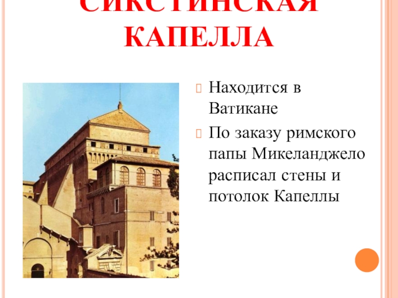 СИКСТИНСКАЯ КАПЕЛЛАНаходится в ВатиканеПо заказу римского папы Микеланджело расписал стены и потолок Капеллы