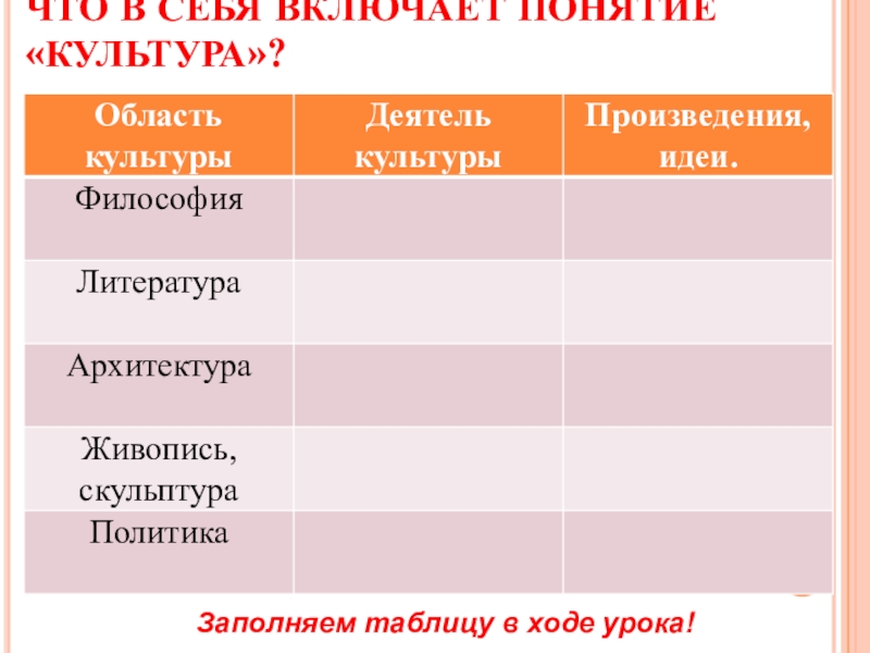 ЧТО В СЕБЯ ВКЛЮЧАЕТ ПОНЯТИЕ «КУЛЬТУРА»? Заполняем таблицу в ходе урока!