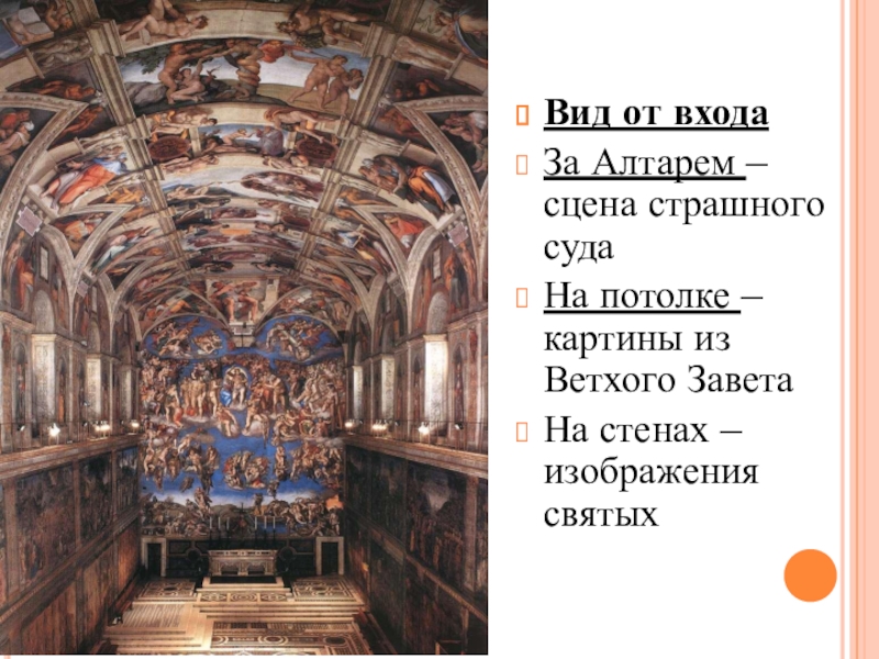 Вид от входаЗа Алтарем – сцена страшного судаНа потолке – картины из Ветхого ЗаветаНа стенах – изображения