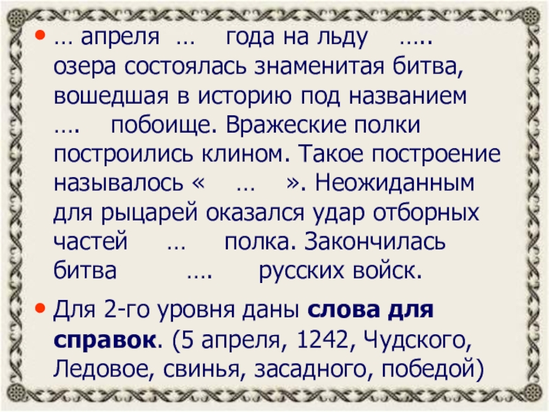 Для 2-го уровня даны слова для справок. (5 апреля, 1242, Чудского, Ледовое, свинья, засадного, победой)