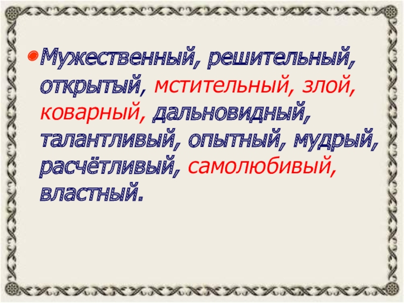 Мужественный, решительный, открытый, мстительный, злой, коварный, дальновидный, талантливый, опытный, мудрый, расчётливый,