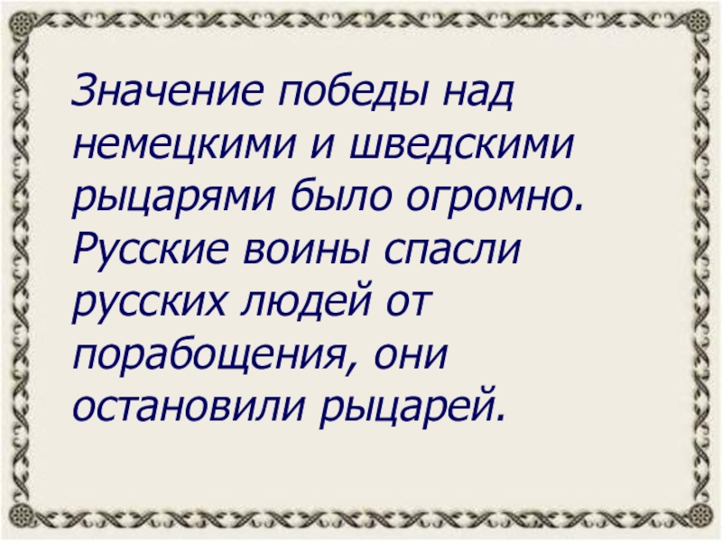 Значение победы над немецкими и шведскими рыцарями было огромно. Русские