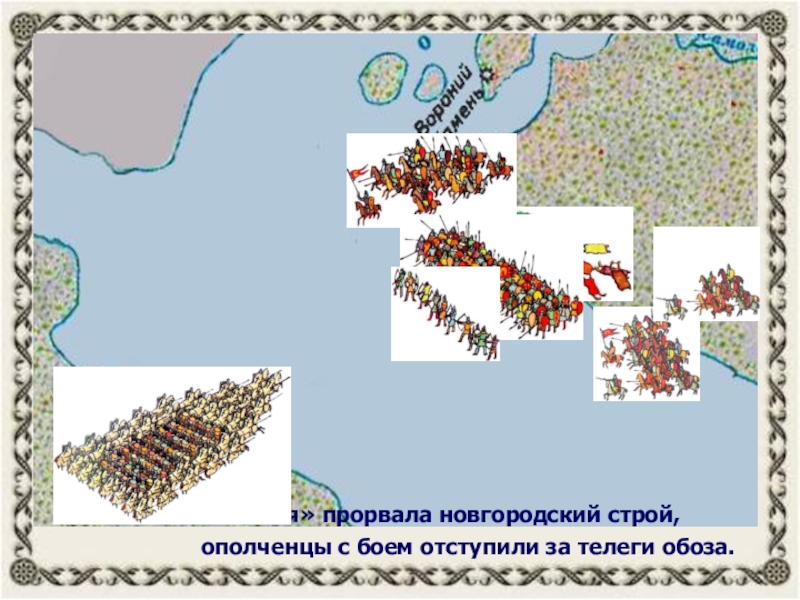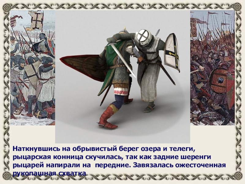 Слайд 16Наткнувшись на обрывистый берег озера и телеги, рыцарская конница скучилась, так