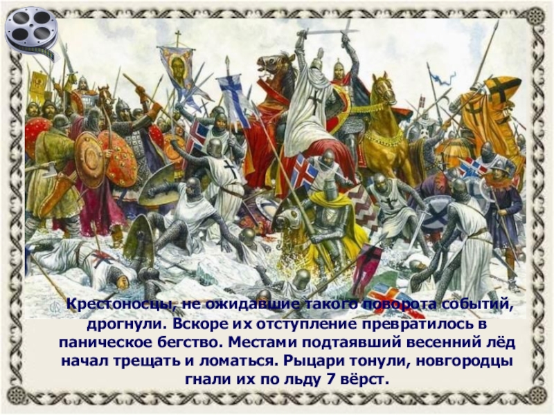 в паническое бегство. Местами подтаявший весенний лёд начал трещать и ломаться. Рыцари тонули, новгородцы гнали их по льду 7 вёрст.