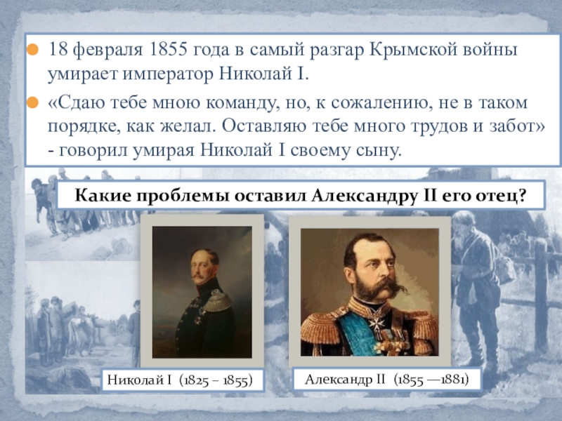 «Сдаю тебе мною команду, но, к сожалению, не в таком порядке, как желал. Оставляю тебе много трудов и забот» - говорил умирая Николай I своему сыну.