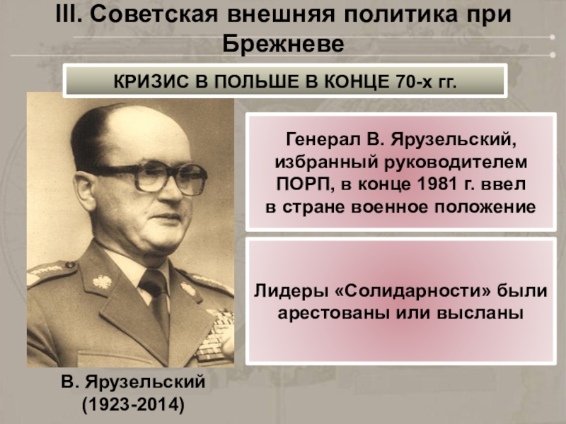 Генерал В. Ярузельский, избранный руководителем ПОРП, в конце 1981 г. ввел в стране военное положение