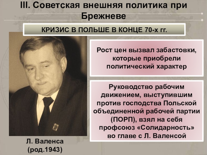 Руководство рабочим движением, выступившим против господства Польской объединенной рабочей партии (ПОРП), взял на себя профсоюз «Солидарность» во главе с Л. Валенсой