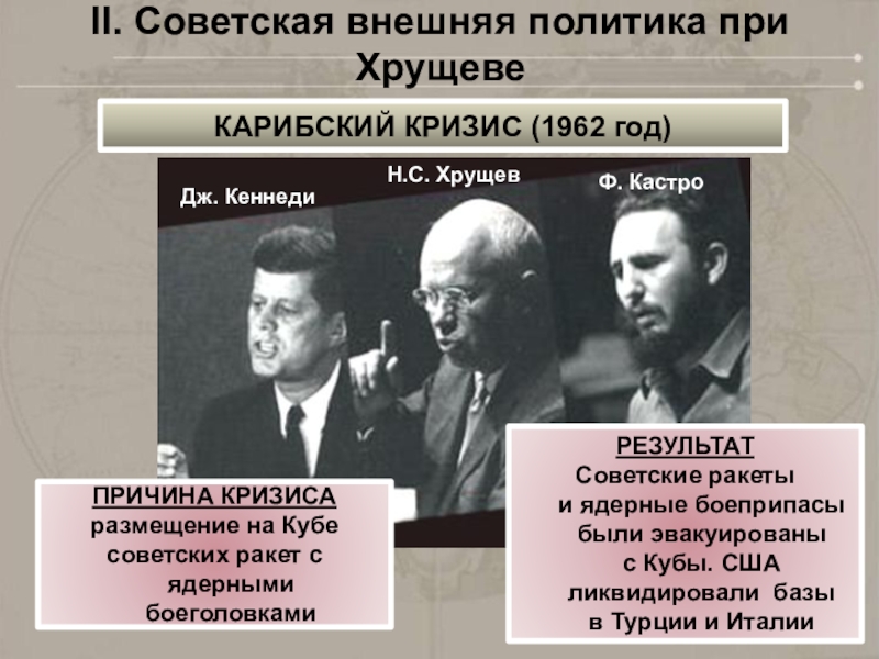 Советские ракеты и ядерные боеприпасы были эвакуированы с Кубы. США ликвидировали базы в Турции и Италии