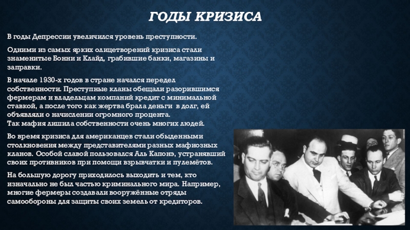Во время кризиса для американцев стали обыденными столкновения между представителями разных мафиозных кланов. Особой славой пользовался Аль Капонэ, устранявший своих противников при помощи взрывчатки и пулемётов.