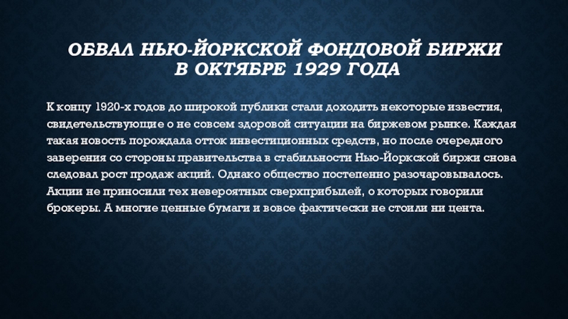 до широкой публики стали доходить некоторые известия, свидетельствующие о не совсем здоровой ситуации на биржевом рынке. Каждая такая новость порождала отток инвестиционных средств, но после очередного заверения со стороны правительства в стабильности Нью-Йоркской биржи снова следовал рост продаж акций. Однако общество постепенно разочаровывалось. Акции не приносили тех невероятных сверхприбылей, о которых говорили брокеры. А многие ценные бумаги и вовсе фактически не стоили ни цента.