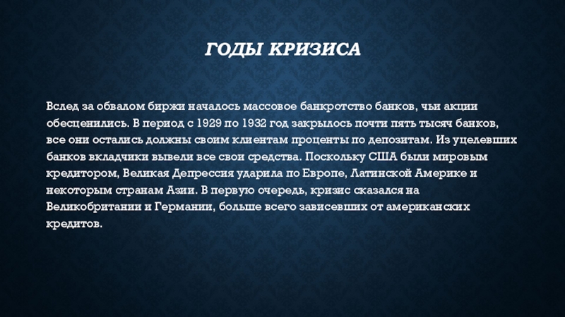 обесценились. В период с 1929 по 1932 год закрылось почти пять тысяч банков, все они остались должны своим клиентам проценты по депозитам. Из уцелевших банков вкладчики вывели все свои средства. Поскольку США были мировым кредитором, Великая Депрессия ударила по Европе, Латинской Америке и некоторым странам Азии. В первую очередь, кризис сказался на Великобритании и Германии, больше всего зависевших от американских кредитов.