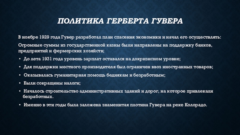 Именно в эти годы была заложена знаменитая плотина Гувера на реке Колорадо.