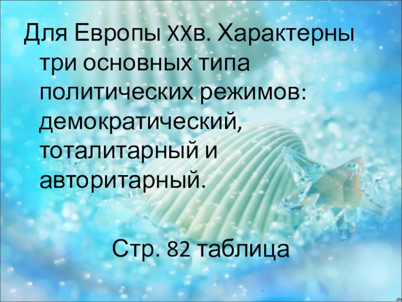 Для Европы XXв. Характерны три основных типа политических режимов: демократический, тоталитарный и авторитарный.Стр. 82 таблица