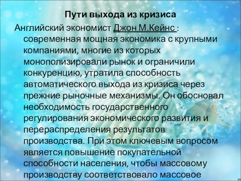 Пути выхода из кризисаАнглийский экономист Джон М.Кейнс : современная мощная экономика с крупными компаниями, многие из которых