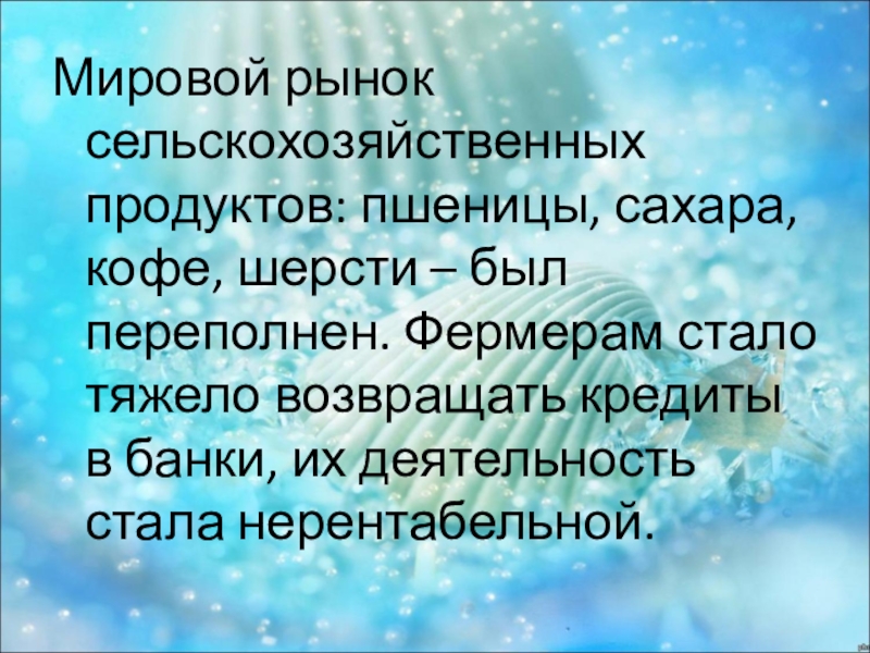 Слайд 4Мировой рынок сельскохозяйственных продуктов: пшеницы, сахара, кофе, шерсти – был переполнен.